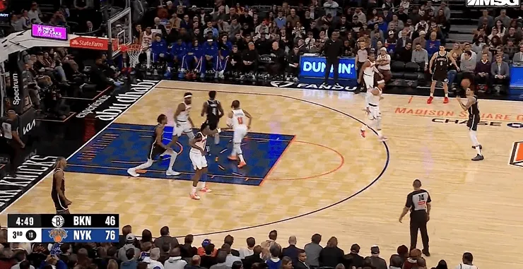 比赛第三节,布伦森中投+助攻米罗空接暴扣,尼克斯领先篮网到32分。